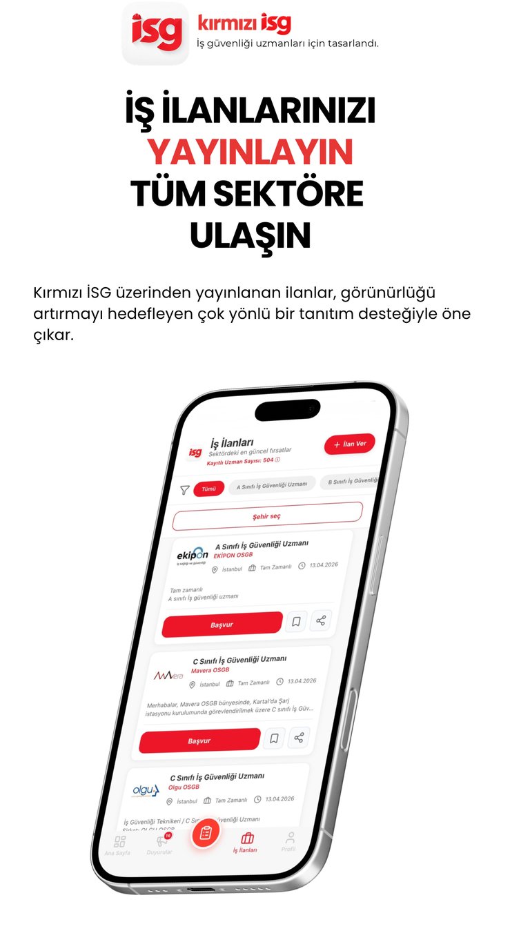 İlanlarınız yalnızca Kırmızı İSG platformunda yayınlanmakla sınırlı kalmaz; uygun olması halinde WhatsApp, Telegram, Instagram ve benzeri sosyal ağlarda da paylaşılabilir. Böylece ilanınız sadece uygulama kullanıcılarına değil, iş arayan ve sektörü düzenli olarak takip eden daha geniş bir kitleye ulaşma imkânı kazanır. Özellikle iş güvenliği uzmanı, iş yeri hekimi, İSG teknikeri ve ilgili diğer pozisyonlarda doğru adaya ulaşmanın zaman zaman zorlaştığı durumlarda, ilanın farklı mecralarda görünür olması önemli bir avantaj sağlar. Farklı kanallarda yer alan ilanlar, daha fazla kişi tarafından fark edilerek görünürlüğünü artırabilir, başvuru potansiyelini güçlendirebilir ve ilanınızın daha kısa sürede doğru adaylarla buluşmasına katkı sağlayabilir.